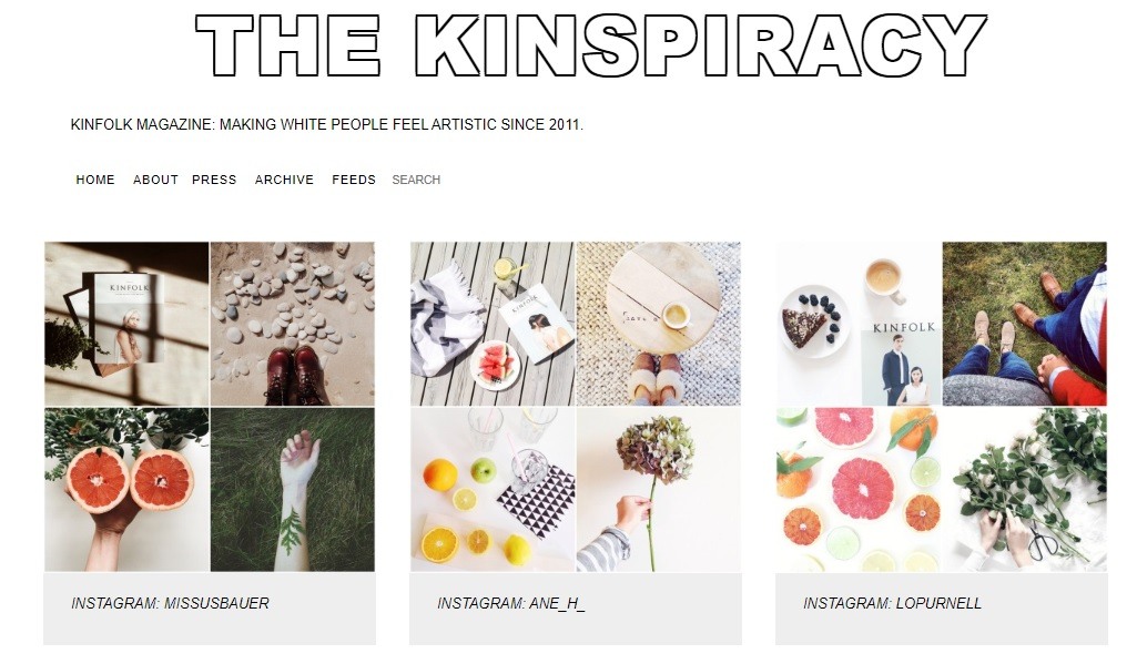 インスタグラム上では、刊行後から徐々に Kinfolk に影響された写真が、しばしば、「#kinfolk」というハッシュタグ、さらに「#liveauthentic」(本当の生活を生きる)というハッシュタグとともに投稿されるようになった。そういった写真の多くは、被写体としては陶器のカップに注がれたカフェラテやコーン付きのアイスクリーム、色味を抑えた洗いざらした色調、単色の壁の背景、テーブルやベッドの上にものがアーティスティックにちらばった状態を真上から映す、身体の一部を写し込むなどの特徴を持っている(例としては、その雑誌から影響を受けたインスタグラムのユーザーの投稿を集めたサイト、Kinspiracy を参照)。このような、Kinfolk 風の写真をインスタグラム上で再現することは、加工機能も併用すると比較的容易なため、その創刊者たちも驚くほど急速に投稿が増えていった。そのようなイメージの多くは、撮影場所としてはカフェや自室などの日常的な場面が多く、屋外だとしても、有名な場所やあからさまに消費行動を思わせる場所は選ばれない。ここでは、前回見たカラフルだったり驚きをもたらしたりする「インスタ映え」的な写真の多くとは異なり、何が主題となっていて、どこに価値を見出せば良いのかは、(その美学に共感する者以外には)明白ではない。つまり、そのような写真の多くは、インスタ映えする写真とは異なる美学を示している。結論から言うと、Kinfolk 的な美学は、上で述べた他者とは差異化された経験、日常生活に手を加えて得ることのできた「上質な」経験を伝達するための文法として広まったように思われる。