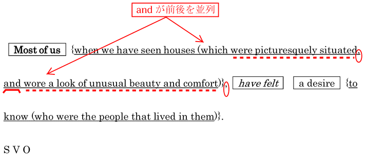 但し、文法的理解と訳は別。when 以下を most of us に掛け、後のカンマを主部終了のしるしのように訳す(「~な家を見た時の我々は、―を感じた」)のは許される。