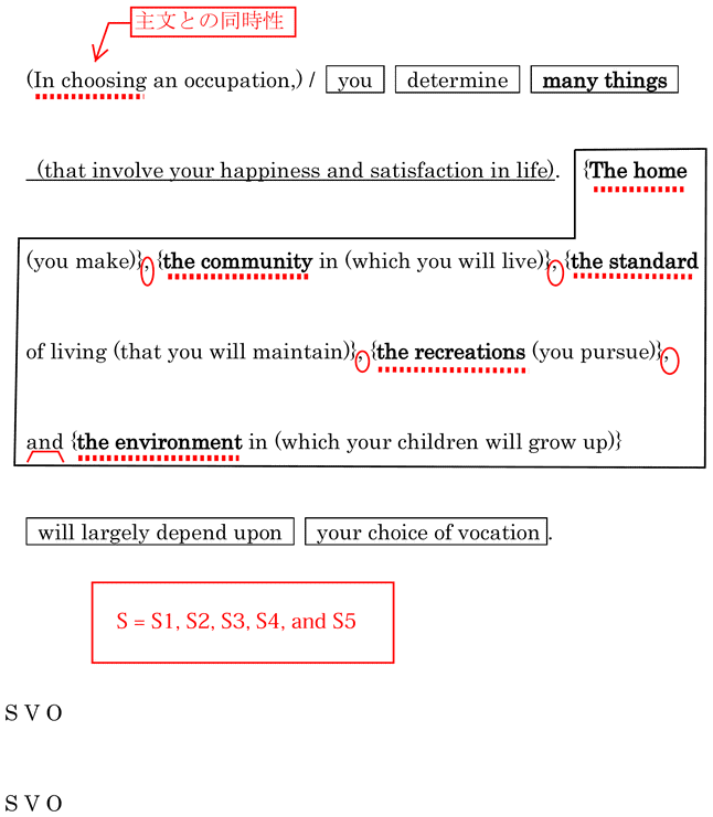 英語はバランスを重んじる言語だからである。それで意味の通じない時に限り、2のみに掛けるようにするのがよい。ここも「幸福と人生における満足」でなく「人生における幸福と満足」と読む。さらに言えば、happiness、satisfaction は同義語反復。英語はリズムをつけるために同義語反復を多用する。この点からも、1と2は一体と見るのがよい。