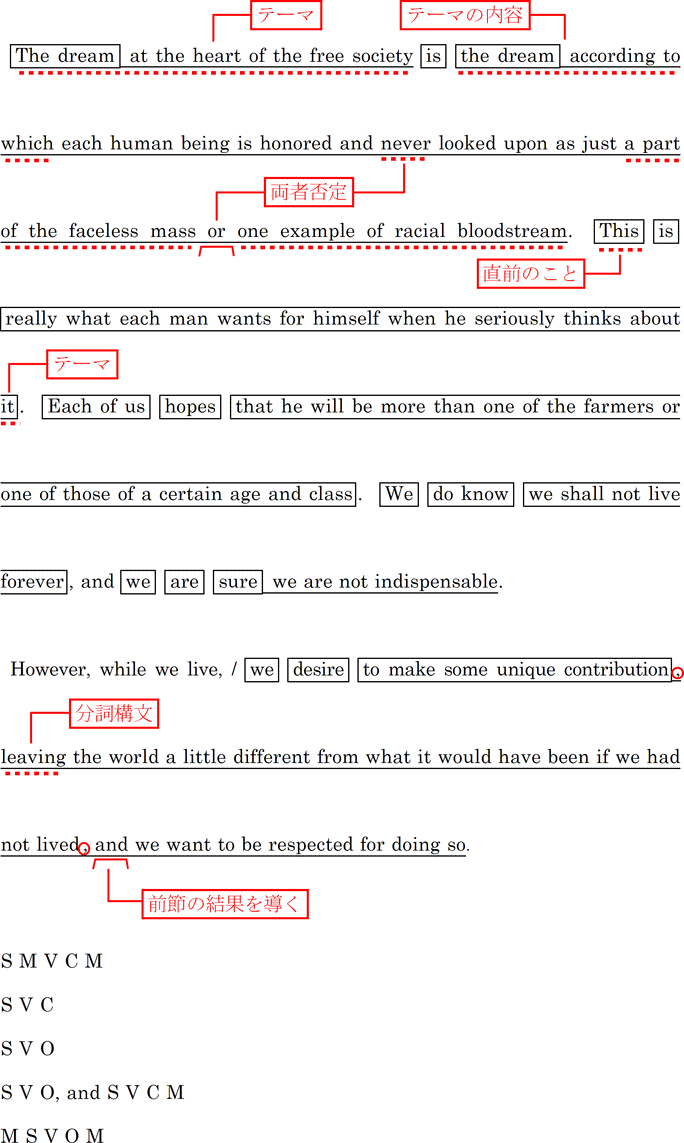 自由社会の根底にある夢は、人間ひとり一人が尊重され、没個性の集団のごく一部とも民族の血脈の標本とも見なされることは決してないという夢である。夢について真剣に考えてみれば、これこそ誰もが自分のために望んでいるものである。我々はみな、自分がひとりの農民以上のもの、ある世代・集団の一員以上のものとなることを望んでいる。また自分が永遠に生きるものではないことは十分承知しているし、自分が不可欠の存在でないこともよく分かってはいる。それでも我々は生きている間、何か独自の貢献をすることで、世を去るときには世界を自分が生まれなかった場合と少しは違うものとすることを願い、そうすることに対して尊敬を受けたいと思うのである。