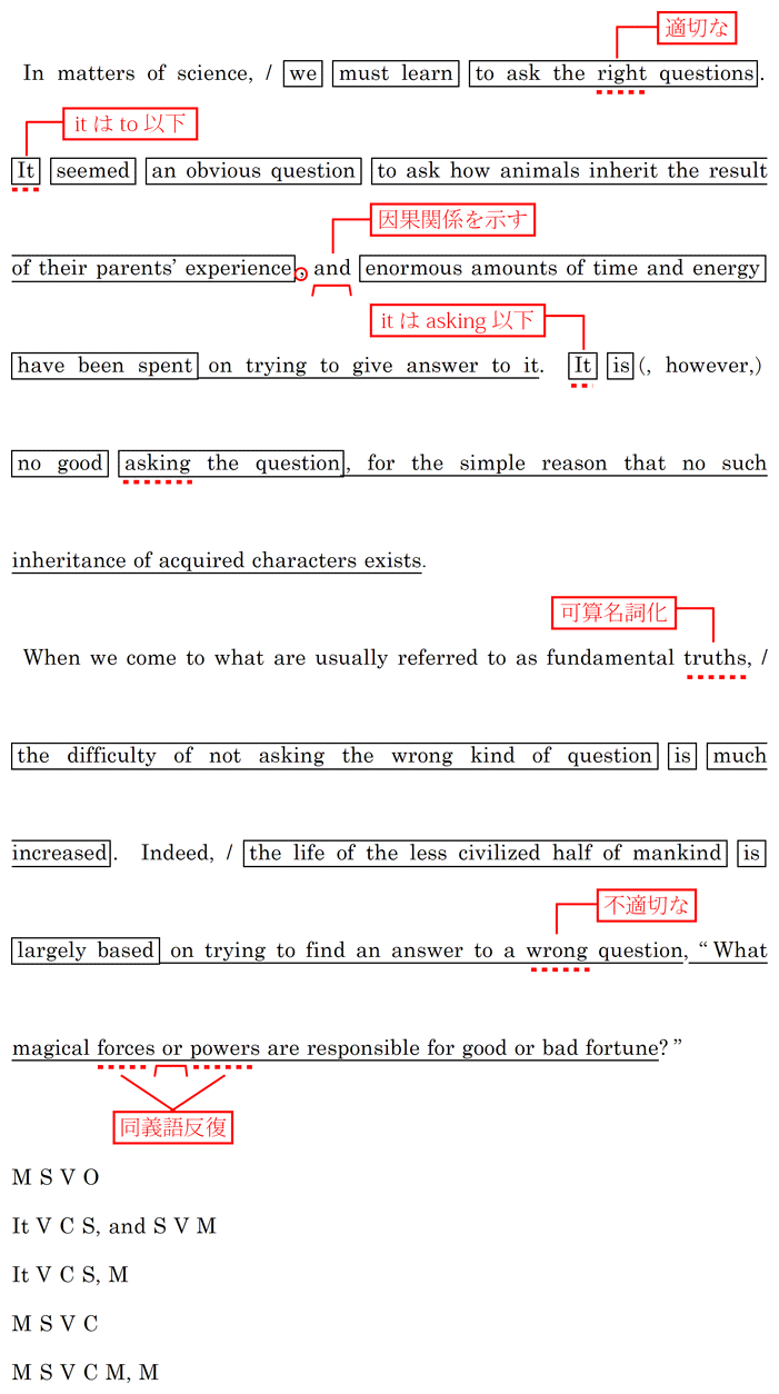科学上の問題においては、適切な質問をすることができるようでなければならない。動物は親の体験の結果をどのように引き継ぐのかを問うことは、かつては正当な質問と考えられ、莫大な時間と労力がその問題を解くことに向けられてきた。しかし、そのような問いをすること自体無益である。この種の獲得形質の遺伝そのものが存在しないからである。通常、基本的事実と呼ばれているようなことに取り組む場合は、解答不能の質問をしないようにするのはずっと難しくなる。それどころか、文明のあまり進んでいない人々の生活は「どのような魔力が原因で幸運不運は生ずるか」という、質問自体が間違っていることに答えようとすることに基づいているのが多いのである。