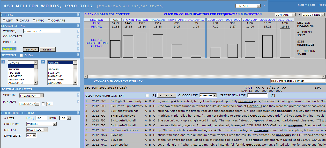 辞書で《略式》や (informal) というレーベルが貼られていたことから、とりわけ話し言葉において頻度が高いだろうと予想されました。確かに予想通り SPOKEN サブコーパスで頻度が100万語当たり15.15回と高かったのですが、意外と書き言葉のジャンルである FICTION, MAGAZINE, NEWSPAPER でもそれぞれ 16.84, 15.88, 9.05 回と、ある程度の頻度を示しています。それでも、例文を眺めると SPOKEN 以外のサブコーパスでも引用符に囲まれた発話のなかで gorgeous が用いられている場合が多いことから、話し言葉としての性質が強いことは確認できます。この解釈は、ACADEMIC サブコーパスで頻度が相対的に低いこととも矛盾しません。gorgeous dress, gorgeous flowers, gorgeous scenery など従来の「華麗な、豪華な」の語義も健在ですが、gorgeous woman, gorgeous body など人の性的な魅力を示す、口語的な形容詞としての使用例が目につきます。[2]