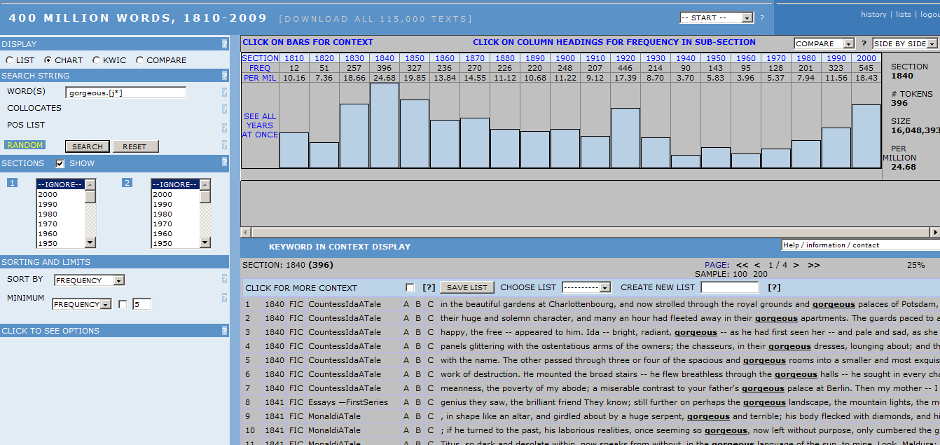 OED によると、gorgeous という語は15世紀終わりから用いられており、長い間「華麗な、豪華な」が基本的な語義でしたが、口語で一般的に賞賛を表わす新しい語義が19世紀後半から現れ出しました。しかし、新しい語義が広く用いられるようになったのは20世紀に入ってからのようであり、とりわけ頻度が高くなったのは20世紀後半から21世紀にかけてのここ数十年ほどのことではないかと疑われます。前回 Google Books Ngram Viewer で英米両変種での gorgeous の頻度の推移を調べましたが、グラフによると20世紀の間に漸減していた gorgeous の頻度が1980年代半ば以降に再び回復してきたように見えました。これはこの語が「すてきな、すばらしい」の新語義において特に口語で頻度が高まってきたことの反映かもしれません。しかし、アメリカ英語とイギリス英語とでは頻度もその伸び方も異なるようでした。いずれにせよ、新語義の定着と各変種での分布がどのような関係にあるのか、詳しく調べる必要があります。