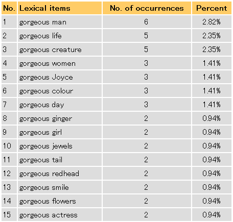 次に BNCweb で gorgeous の使用について調べてみましょう。[4] まずは、共起表現からです。検索語入力画面より gorgeous_AJ* _N* (gorgeous の次に被修飾名詞が来る組み合わせ)で検索した結果の画面より、右上のドロップダウンメニューから Frequency breakdown を選びます。gorgeous の右に共起しやすい名詞を降順に並べた一覧が、下図の通りに現われます。man, woman, girl, redhead など、人の賛辞に用いられる新語義とおぼしき用例が少なくないことが分かります。