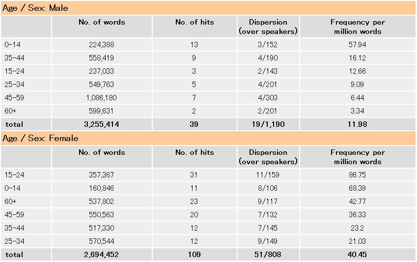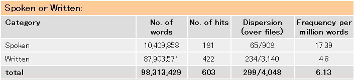 この表から明らかなことは、辞書の《略式》や (informal) というレーベルから予想される通り、この語は書き言葉よりも話し言葉で頻度が顕著に高いことです。100万語中の出現頻度は書き言葉で4.8回に対して話し言葉で17.39回あり、統計的には p < 0.0001 の水準で有意差が認められます。