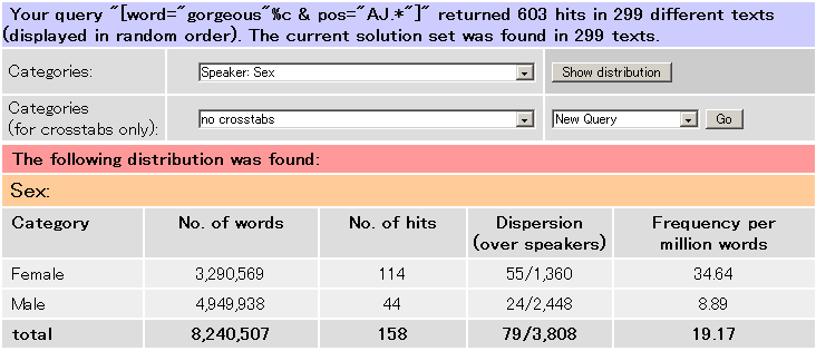 次に、詳細な分布を調べましょう。検索画面に戻り gorgeous_AJ* 単体で検索し直してみます。先ほどと同じドロップダウンメニューから Distribution を選んで をクリックします。切り替わった画面では、様々なカテゴリーごとの gorgeous の頻度が一覧できます。最上部には話し言葉サブコーパス(約1000万語)と書き言葉サブコーパス(約9000万語)における gorgeous の頻度の違いが、以下の通りに整理されています。