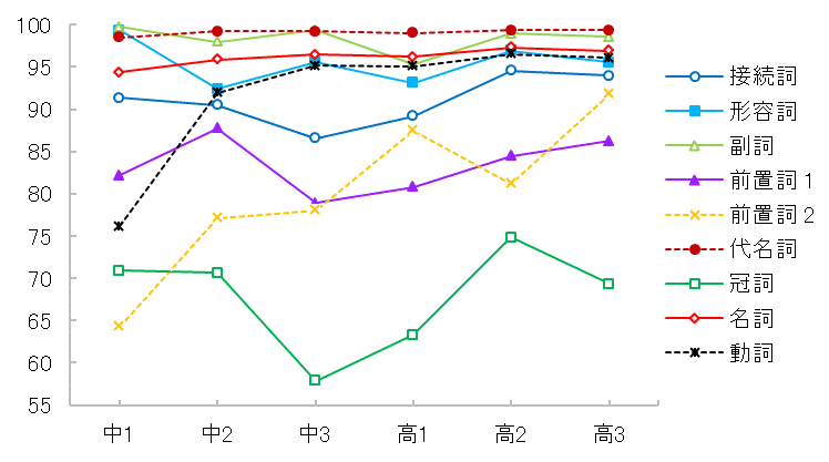 | 2. | 中学3年生から正用率が安定して上がる | ⇒ | 「接続詞、一般的な前置詞」 |