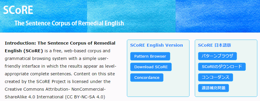 SCoRE(The Sentence Corpus of Remedial English)は、文法項目別に英語母語話者が独自に作成した著作権フリーの英語用例を日本語対訳文とともに利用できるコーパスで、初級やリメディアルの学習者を主な対象としています。[8] 約6,000の英語用例から成る小規模コーパスで、登録不要で誰でも無料で使用でき、使いやすいインターフェイスを備えています。
