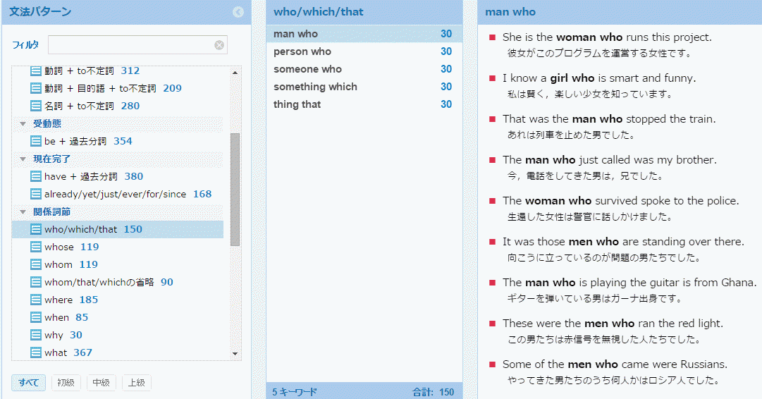 5つのキーワード(“man who”, “person who”, “someone who”, “something which”, “thing that”)についての150の結果が表示されました。これらの検索結果は、キーワードをクリックしてキーワードごとに表示したり、左側の 文法パターン の一番下の、初級中級上級 [9] をクリックしてレベルごとに表示したりすることができます。授業でこれらの多量の用例を提示することで、学習対象の文法項目について、学習者の「気づき」を促す効果が期待できます。検索結果をより意識的に解釈するタスク(例: 学習項目についての英作文の誤りを、用例を見て直す)を行うと、「気づき」を促す効果はさらに高まるでしょう。[10] 教室で学習者がパソコンを使用できない場合には、印刷した検索結果を見ることでも、同様の効果が期待できるという研究結果があります。[11] また、教員の検索結果を OHP で提示することもできます。
