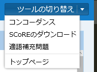 SCoRE には他に「コンコーダンス」の機能があり、単語と文法項目を指定してコンコーダンスラインを見ることができます。また、データをダウンロードして使用することもできます。 ツールの切り替え の ▼ をクリックし、「コンコーダンス」「ダウンロード」をクリックして使用します。