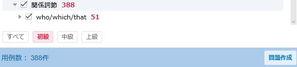 次の画面が開きます。先ほどと同様に 関係詞節 の “who/which/that” をチェック し、左下の 初級 をクリックしてレベルを指定し、問題作成 をクリックしてみます。