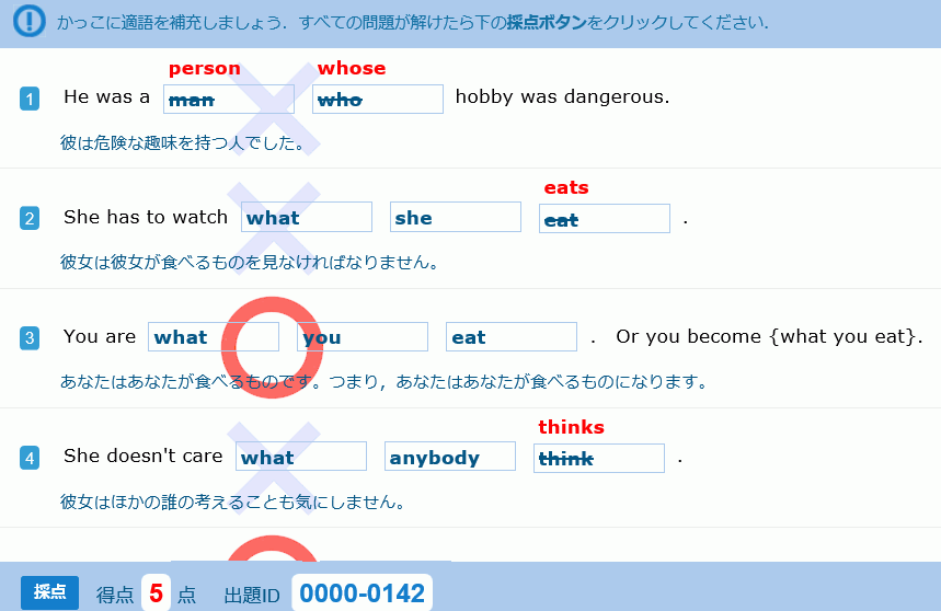「適語補充問題」の使用により、学習者のレベルや苦手な文法項目にきめ細かく対応することができます。
