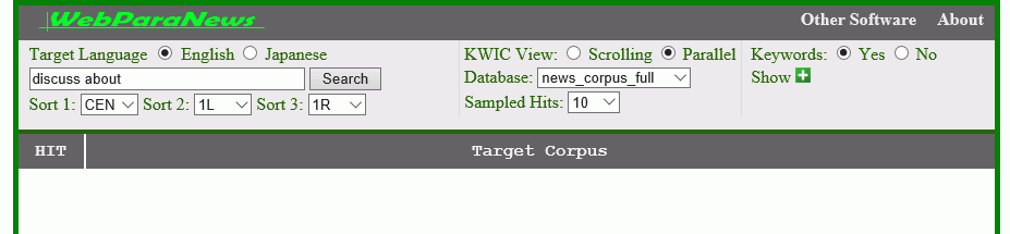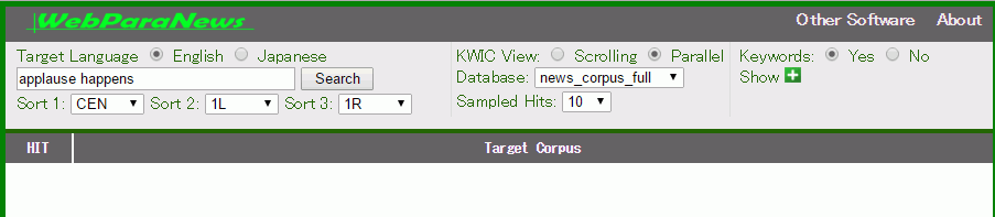 WebParaNews は、著作権の問題をクリアした英語・日本語各15万文の日英新聞記事対応付けデータ[12] を検索できる、登録不要の Web 検索サイトです。学習者や教師を主な対象としており、誰でも無料で使用でき、検索語を入れるだけで検索結果が得られる使いやすいインターフェイスを備えています。[13]