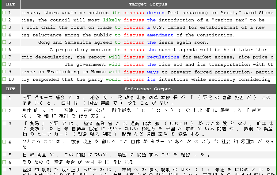 日英パラレルコーパスとは日本語の文と英語の文が対訳でまとめられたコーパスです。[7] DDL を中学生・高校生や英語があまり得意でない大学生が行う場合、日英パラレルコーパスを使用すると学習者は日本語の助けにより用例の解釈がしやすくなります。今回は教育用例文コーパス SCoRE と、教師・学習者向けの Web 検索サイトである WebParaNews を紹介します。