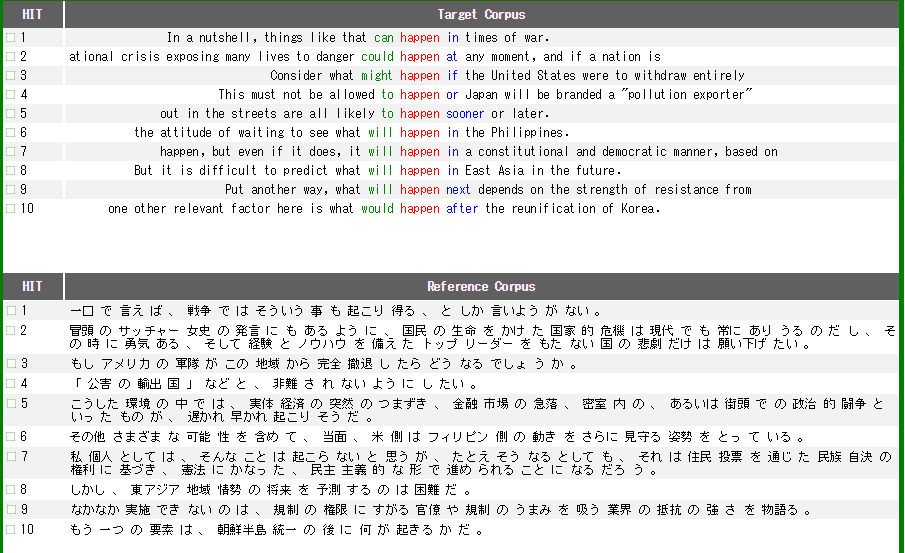 [16] WebParaNews ではレマ化(語幹が同じ表記形をまとめること、例えば “happen” を検索すると “happen”, “happens”, “happened”, “happening” がヒット)ができないため、検索結果に偏りが出てしまうことがあります。上記の“happen”の場合、助動詞とともに使用される例が多いのは、原形で検索していることが影響している可能性が考えられます。