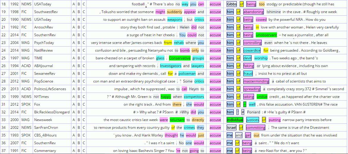 “accuse” のコンコーダンス・ラインが現れました。品詞ごとに色分けされているので、品詞が結びつくパターンを見つけやすくなっています。(~ のことで人を非難する)に対応するのは “accuse 人 of 動名詞” と “accuse 人 of 名詞” であり、“accuse” の用例としてこれらが突出して多いことがわかります。辞書で調べてもこの用例は収録されていますが、突出して多い特徴的な用法であることは、必ずしも明示されているわけではありません。調べる前にこのパターンが書けなかった学生、迷った学生ほど、「気づき」が強く促されるのではないでしょうか。
