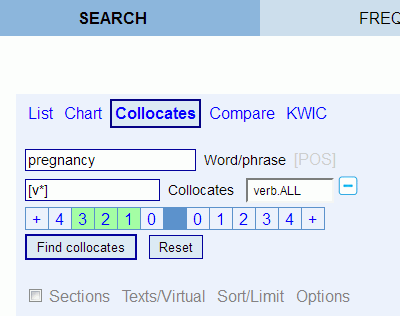 まず SEARCHをクリックし、CollocatesモードにしてWord/phraseに “pregnancy” と入力します。すぐ下のCollocatesの右の[POS]は検索語と共起する品詞を指定するもので、ここでは[POS]をダブルクリックしてverb.ALL(すべての動詞)を指定し、Collocatesの欄に [v*](すべての動詞という意味のタグ)が入力されたことを確認します。その下の数字は検索語の前後何語までを含めるか指定するもので、この場合は “pregnancy” の前に来る動詞を見るため、冠詞や形容詞が入る場合を想定して “pregnancy” の左3語までを検索することにして、左の3をクリックし3から1までを指定します。最後にFind collocatesをクリックします。